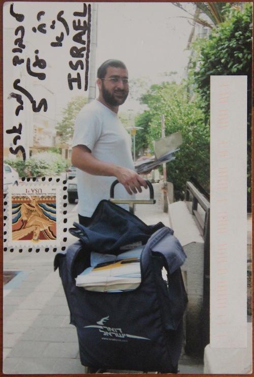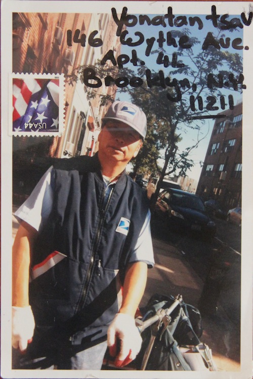 "I once met a former mailman at an exhibition were I presented a Giving Yourself Away postcard. It was adressed to my mailman at 'The mailman of Yonatantsav, 167 13th st, Brooklyn, Ny 11211'. He told me that by the postal regulations booklet he will not be able to take the postcard even though it has his image and is addressed to him. I responded that this was totally unfair. I am happy to have never received this postcard at my address".