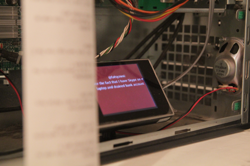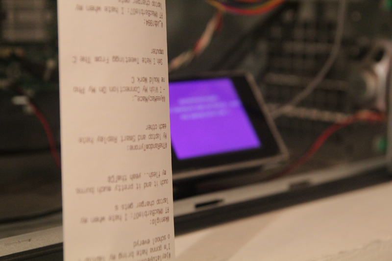 A machine with low self esteem wonders in the tweetersphere. To its misfortune its artificial intelligence allows it to read only words of anger towards machines. All it can do is keep the hate sentences in its memory and spit them out on paper, black on white.